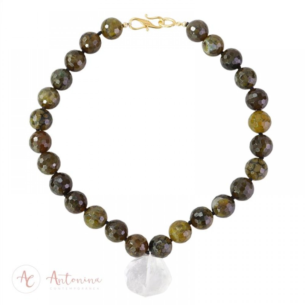 Colar Ágata Verde Musgo Com Cristal Quartzo Facetado