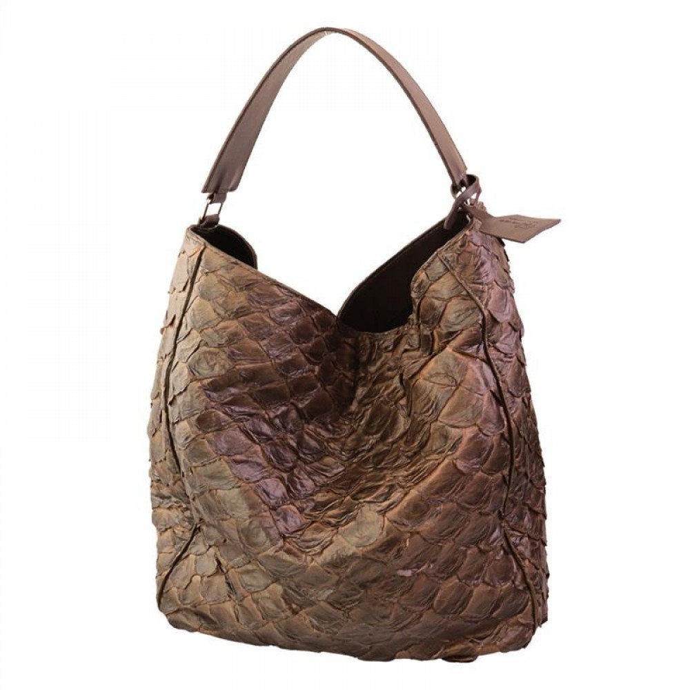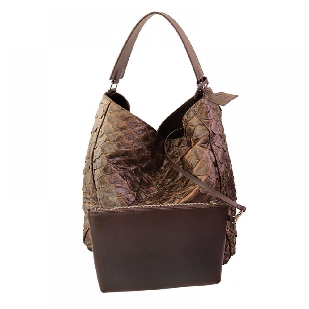 Confeccionada em couro de pirarucu, a bolsa revela uma textura única e natural, valorizando cada detalhe com autenticidade. Na tonalidade café, transmite sobriedade e versatilidade, enquanto as ferragens prateadas adicionam um toque contemporâneo e refinado ao acabamento.